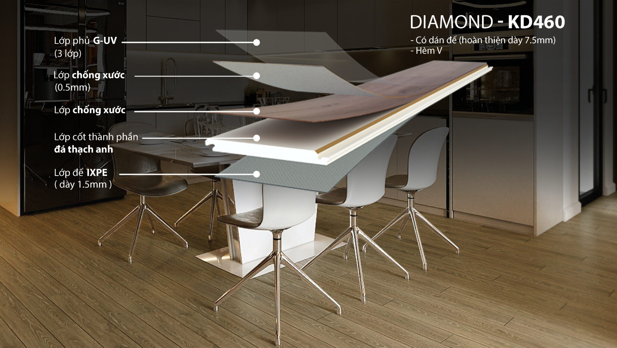 - Lớp chống xước (0.5mm): Giữ cho bề mặt sàn bền đẹp trước các tác động từ ngoại lực. Khả năng chống trầy xước đạt chuẩn AC6 cao nhất theo chuẩn châu Âu, duy trì độ sáng bóng cho Sàn Thạch Anh